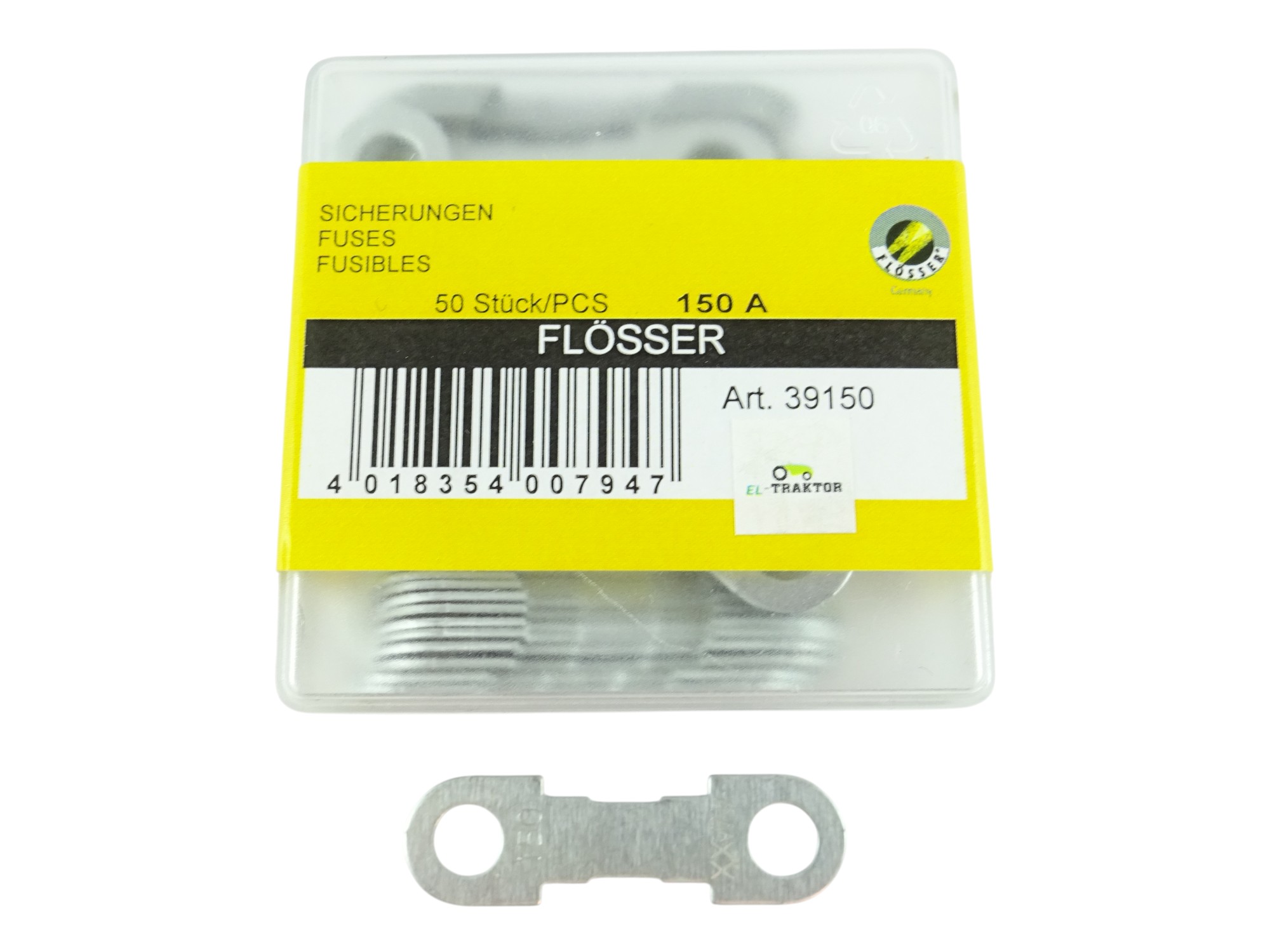 Bezpiecznik HSB 150A Flösser 39150 to wysokoprądowy bezpiecznik paskowy (strip fuse), przeznaczony do ochrony głównych obwodów elektrycznych w pojazdach i maszynach. Stosowany w instalacjach o dużym poborze prądu, zapewnia skuteczną ochronę układów przed przeciążeniem i zwarciem.