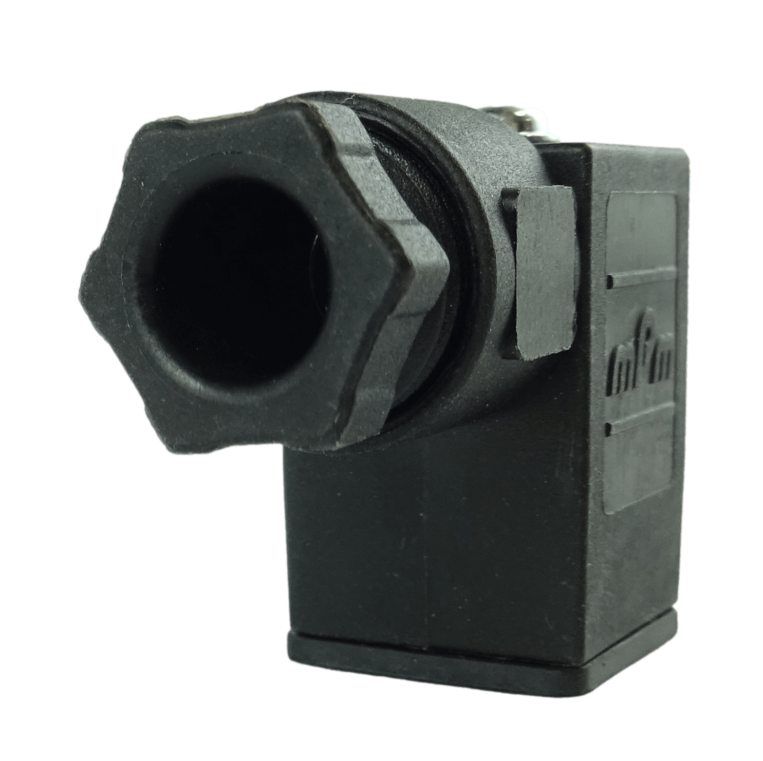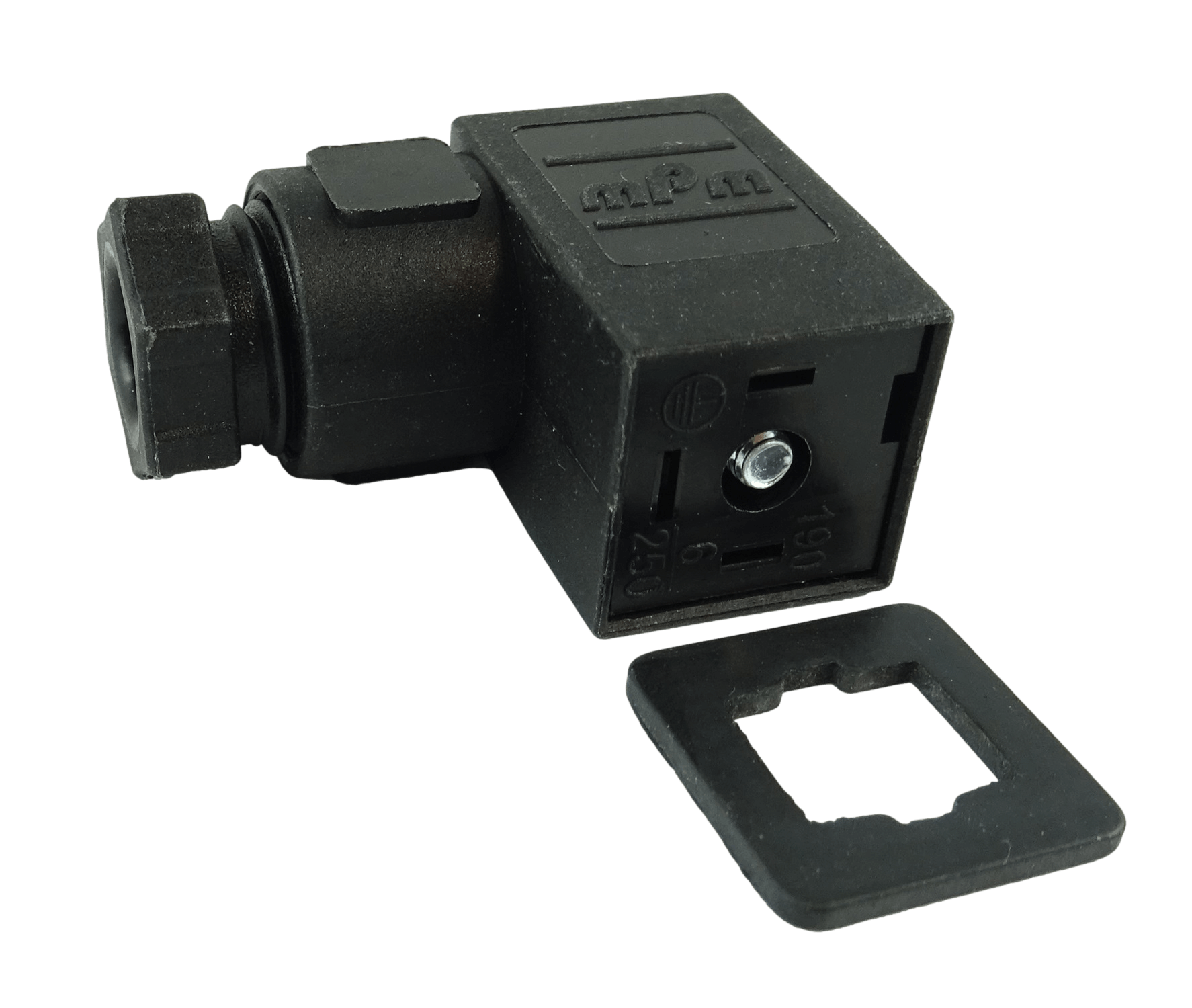 Złącze zaworowe DIN 3-pin (żeńskie) o rozstawie styków 9,4 mm, przeznaczone do cewek i zaworów elektromagnetycznych w instalacjach hydraulicznych i pneumatycznych.