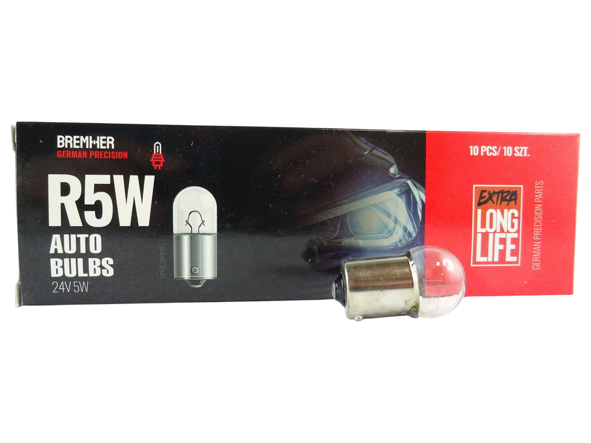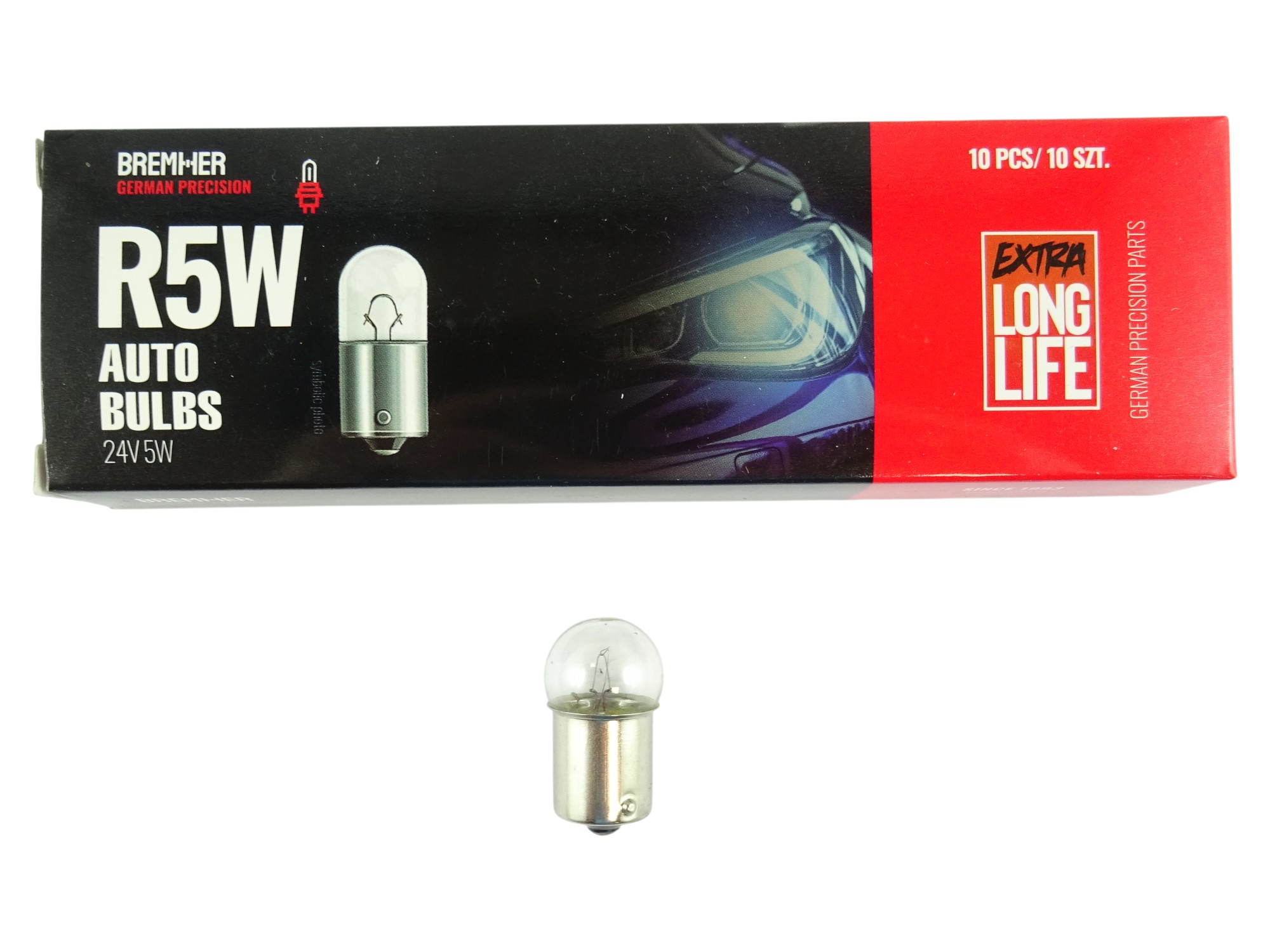 Prezentowana żarówka typu R5W 24V 5W marki Bremher to standardowa żarówka sygnalizacyjna o trzonku BA15s, widocznym na zdjęciu. Produkt pochodzi z linii EXTRA LONG LIFE, co oznacza wydłużoną żywotność w porównaniu z podstawowymi wersjami.